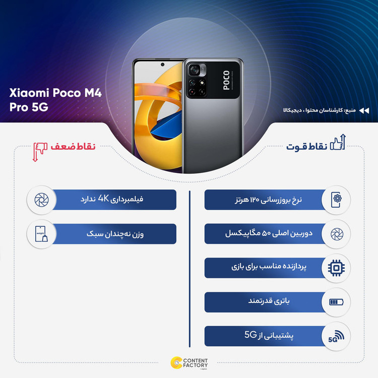 سری پوکو گوشیهای هوشمند میانرده شیائومی تا به امروز توانستهاند با بهره بردن از مشخصات فنی مناسب و البته قیمت مقرون بهصرفه، عملکرد بسیار خوب و قابل قبولی را از خود بهنمایش بگذارند. یکی از گوشیهای هوشمند میانرده جدید و مقرون بهصرفه این شرکت، Poco M4 Pro 5G است که میتوان گفت در جایگاه یک گوشی هوشمند میانرده به مشخصات فنی مناسب و البته قدرتمندی مجهز شده است. در نمای روبهرویی این گوشی از صفحهنمایش با ابعاد 6.6 اینچ و رزولوشن 1080×2400 پیکسل از نوع IPS LCD مجهز شده است. نمایش 399 پیکسل در هر اینچ در کنار ارائه نرخ بروزرسانی 90 هرتز سبب شده تا عملکرد بسیار خوب و کاملا قابل قبولی را از این صفحهنمایش در شرایط نوری متنوع شاهد باشید. یک سنسور دوربین اصلی قدرتمند با رزولوشن 50 مگاپیکسل در کنار سنسور با رزولوشن 8 مگاپیکسل از نوع فوق عریض (ultrawide)، سنسورهای دوربین دوگانه Poco M4 Pro 5G را تشکیل میدهند. بهره بردن از سنسور دوربین اصلی قدرتمند سبب شده تا خروجی تصاویر بسیار باکیفیتی را از این گوشی هوشمند میانرده شاهد باشید. بریدگی دایرهای شکل ناچ در قسمت بالایی و مرکزی صفحهنمایش، سنسور دوربین سلفی با رزولوشن 16 مگاپیکسل را در خود جای داده است. حضور پردازنده دیمنسیتی 810 شرکت مدیاتک (MediaTek Dimensity 810 5G ) سبب شده تا سوای عملکرد مناسب و قابل قبول در اجرای بازی، توانایی پشتیبانی از شبکههای اینترنتی نسل پنجم یا همان 5G را هم داشته باشد. باتری با میزان ظرفیت 5000 میلیآمپرساعت هم سبب شده تا Poco M4 Pro 5G به ازای هر بار شارژ 100 درصدی، طول عمر مفید دو روز را در استفاده معمولی ارائه کند. شارژر قدرتمند با توان 33 وات و توانایی پشتیبانی از فناوری شارژ سریع هم، توانایی شارژ کامل باتری این گوشی هوشمند میانرده را در مدت زمان 59 دقیقه دارد.