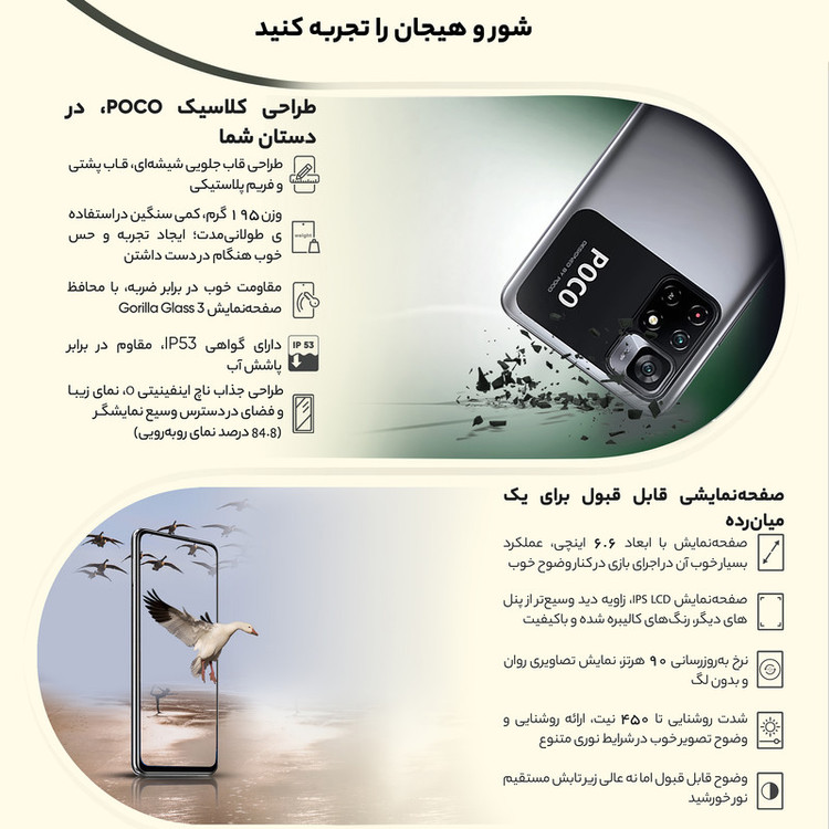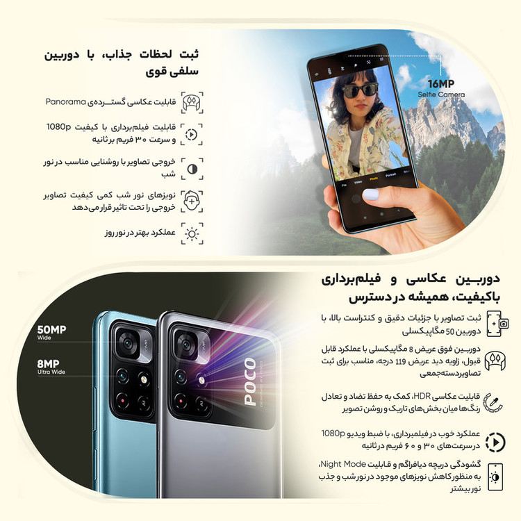 سری پوکو گوشیهای هوشمند میانرده شیائومی تا به امروز توانستهاند با بهره بردن از مشخصات فنی مناسب و البته قیمت مقرون بهصرفه، عملکرد بسیار خوب و قابل قبولی را از خود بهنمایش بگذارند. یکی از گوشیهای هوشمند میانرده جدید و مقرون بهصرفه این شرکت، Poco M4 Pro 5G است که میتوان گفت در جایگاه یک گوشی هوشمند میانرده به مشخصات فنی مناسب و البته قدرتمندی مجهز شده است. در نمای روبهرویی این گوشی از صفحهنمایش با ابعاد 6.6 اینچ و رزولوشن 1080×2400 پیکسل از نوع IPS LCD مجهز شده است. نمایش 399 پیکسل در هر اینچ در کنار ارائه نرخ بروزرسانی 90 هرتز سبب شده تا عملکرد بسیار خوب و کاملا قابل قبولی را از این صفحهنمایش در شرایط نوری متنوع شاهد باشید. یک سنسور دوربین اصلی قدرتمند با رزولوشن 50 مگاپیکسل در کنار سنسور با رزولوشن 8 مگاپیکسل از نوع فوق عریض (ultrawide)، سنسورهای دوربین دوگانه Poco M4 Pro 5G را تشکیل میدهند. بهره بردن از سنسور دوربین اصلی قدرتمند سبب شده تا خروجی تصاویر بسیار باکیفیتی را از این گوشی هوشمند میانرده شاهد باشید. بریدگی دایرهای شکل ناچ در قسمت بالایی و مرکزی صفحهنمایش، سنسور دوربین سلفی با رزولوشن 16 مگاپیکسل را در خود جای داده است. حضور پردازنده دیمنسیتی 810 شرکت مدیاتک (MediaTek Dimensity 810 5G ) سبب شده تا سوای عملکرد مناسب و قابل قبول در اجرای بازی، توانایی پشتیبانی از شبکههای اینترنتی نسل پنجم یا همان 5G را هم داشته باشد. باتری با میزان ظرفیت 5000 میلیآمپرساعت هم سبب شده تا Poco M4 Pro 5G به ازای هر بار شارژ 100 درصدی، طول عمر مفید دو روز را در استفاده معمولی ارائه کند. شارژر قدرتمند با توان 33 وات و توانایی پشتیبانی از فناوری شارژ سریع هم، توانایی شارژ کامل باتری این گوشی هوشمند میانرده را در مدت زمان 59 دقیقه دارد.