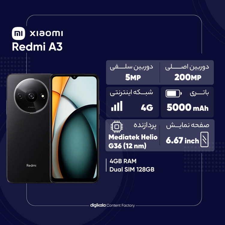 گوشی موبایل شیائومی مدل Redmi A3 دو سیم کارت ظرفیت 128 گیگابایت و رم 4 گیگابایت