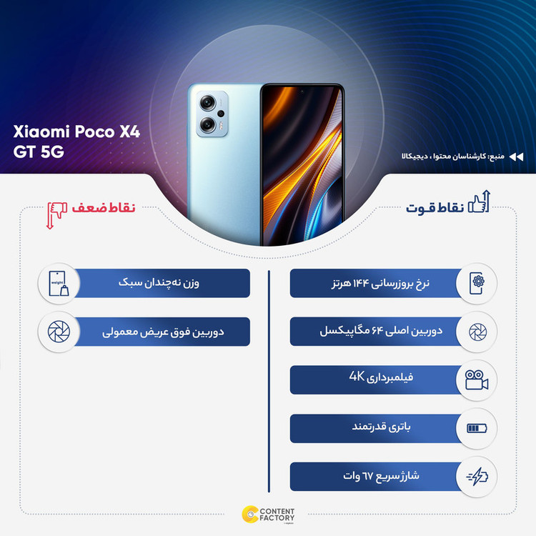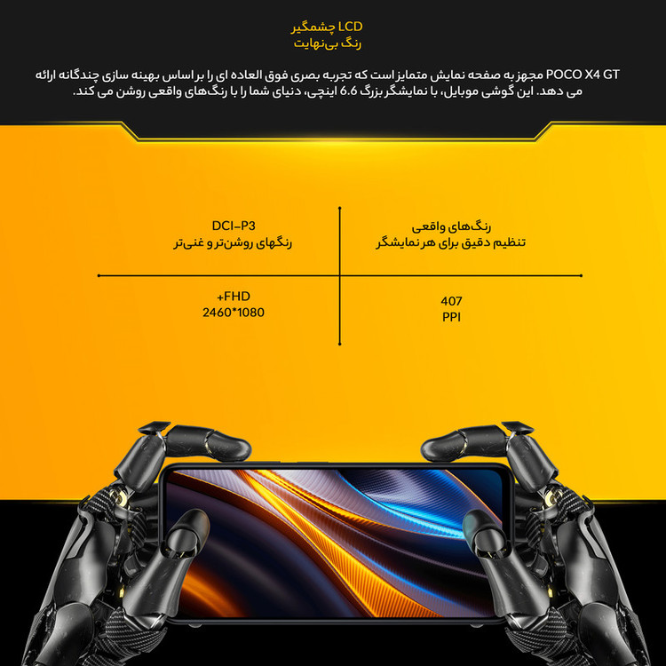 سری Poco گوشیهای هوشمند شرکت شیائومی تا به امروز توانستهاند با بهره بردن از مشخصات فنی مناسب، عملکرد بسیار خوبی را از خود بهنمایش بگذارند. شیائومی Poco X4 GT 5G هم یکی از گوشیهای میانرده این شرکت است که در برخی از مشخصات فنی در نظر گرفته شده، چیزی کم از یک گوشی پرچمدار ندارد. در نمای روبهرویی این گوشی به صفحهنمایش با ابعاد 6.6 اینچ و رزولوشن 1080×2460 پیکسل از نوع IPS مجهز شده که توانایی نمایش 407 پیکسل در هر اینچ را دارد. از جمله مشخصات قدرتمند این صفحهنمایش، میتوانیم به نرخ بروزرسانی بسیار خوب 144 هرتز اشاره کنیم که صفحهنمایشی بسیار روان و باکیفیتی را با خود بههمراه دارد. در قسمت پشتی این گوشی سه سنسور دوربین در نظر گرفته شده است. سنسور دوربین اصلی با رزولوشن 64 مگاپیکسل از نوع عریض (wide) در کنار سنسور 8 مگاپیکسل فوق عریض (ultrawide) و سنسور 2 مگاپیکسل از نوع ماکرو، سنسورهای دوربین سهگانه شیائومی Poco X4 GT 5G را تشکیل میدهند. بریدگی دایرهای شکل ناچ اینفینیتی O در قسمت بالایی و مرکزی صفحهنمایش هم، سنسور دوربین سلفی با رزولوشن 16 مگاپیکسل را در خود جای داده است. در بخش مشخصات سختافزاری هم این گوشی با بهره بردن از پردازنده قدرتمند دیمنسیتی 8100 شرکت مدیاتک، در کنار پشتیبانی از شبکههای اینترنتی نسل پنجم یا همان 5G، عملکرد بسیار خوبی در اجرای بازیهای سنگین و محبوب و همچنین نرمافزارهای کاربردی دارد. باتری با میزان ظرفیت 5080 میلیآمپرساعت هم بهراحتی به ازای هر بار شارژ صد درصدی، توانایی ارائه طول عمر مفید (زمان آماده بهکار) دو روز را در شرایط استفاده معمولی دارد. پشتیبانی از فناوری شارژ سریع با توان 67 وات هم سبب شده تا امکان شارژ صفر تا صد درصدی در مدت زمان 46 دقیقه وجود داشته باشد. در مجموع باید بگوییم که با یکی از گوشیهای هوشمند میانرده بسیار باکیفیت و سطح بالای بازار روبهرو هستید.
