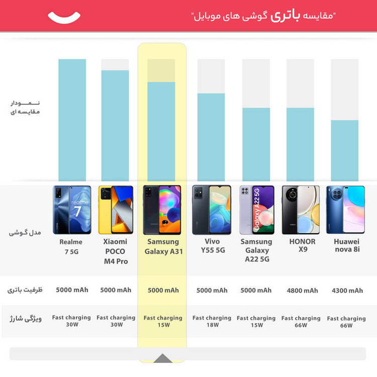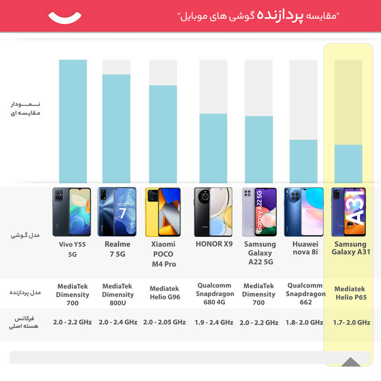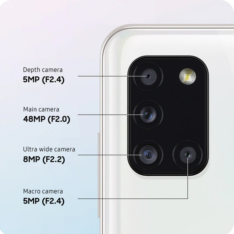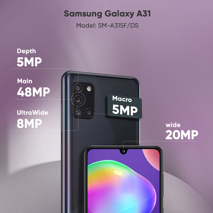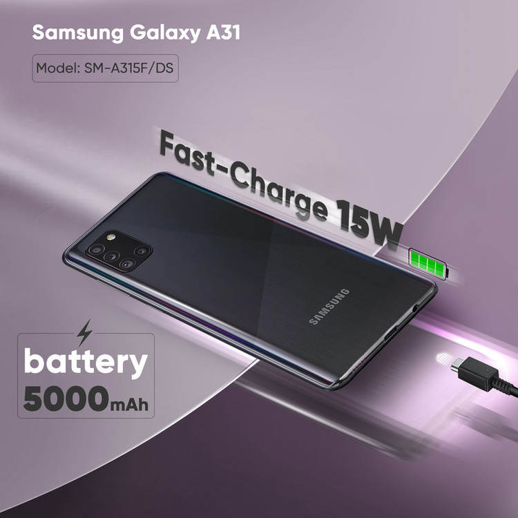 سامسونگ گوشی جدید سری A خود را با نام «A31» در تاریخ 27 آوریل 2020 معرفی کرد. این سری از تولیدات سامسونگ به داشتن صفحهنمایش بسیار با کیفیت AMOLED و دوربینهایی با امکانات بالا شهرت دارند. گوشی موبایل Galaxy A31با صفحهنمایش سوپر آمولد طراحی شده است و ظاهر هم زیبایی دارد. سامسونگ تلاش کرده است حاشیه را در این تولید جدید خود تا حد امکان کم کند. قاب جلویی آن را یک نمایشگر تمام صفحه پوشانده که البته جلوهی زیبایی هم به آن داده است. این محصول سامسونگ با جدیدترین نسخه از سیستمعامل اندروید 10 و رابط کاربری One UI 2.0 روانه بازار شده است تا از هر نظر گوشی مدرن بهحساب بیاید. صفحهنمایش استفادهشده در این گوشی 6.4 اینچ با رزولوشن 2400 در 1080 پیکسل است که با استفاده از فناوری Super AMOLED تصاویر شفاف و بینظیری را به نمایش میگذارد. این صفحهنمایش در هر اینچ 411 پیکسل را نشان میدهد . تراشهی این محصول MediaTek Helio G70 است که به همراه 4 گیگابایت رم عرضه میشود. این گوشی در ظرفیت 128 گیگابایتی عرضه شده است و با استفاده از یک کارت حافظهی جانبی قادر خواهید بود حافظه داخلی را تا یک ترابایت دیگر هم افزایش دهید. این برند برای این گوشی موبایل سامسونگ یک دوربین 4 گانه در نظر گرفته است که شامل یک لنز 48 مگاپیکسلی از نوع عریض (Wide)، یک لنز 8 مگاپیکسلی از نوع فوقعریض (Ultrawide) و دو لنز 5 مگاپیکسلی از نوع ماکرو سنسورعمق است. دوربین سلفی 20 مگاپیکسلی هم در قاب جلویی این گوشی به کار گرفته شده است. باتری 5000 میلیآمپرساعتی، پشتیبانی از فناوری شارژ سریع 15 واتی، درگاه USB Type-C و حسگر اثرانگشت زیر صفحهنمایش هم از دیگر ویژگیهای این تازهوارد است. سامسونگ این گوشی با طراحی کاملاً مطلوب و امکانات فراوان به بازار عرضه کرده است تا در بازار میانردهها هم حرفی برای گفتن داشته باشد.
