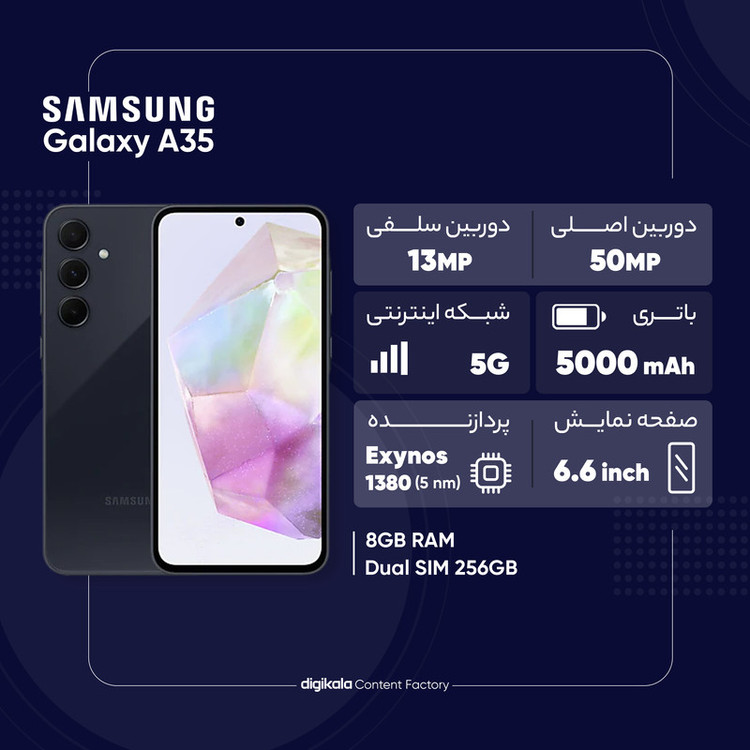 بدون هیچ تعریفی باید بگوییم که گوشیهای هوشمند میانرده سری A سامسونگ توانستهاند با بهره بردن از مشخصات فنی قدرتمند، عملکرد بسیار خوبی را از خود بهنمایش بگذارند. سامسونگ Galaxy A35 یکی از این میانردههای باکیفیت و دوستداشتنی است که به نسبت قیمت در نظر گرفته شده، از مشخصات فنی مناسب و کاملا قابل قبولی بهره برده است. در نمای روبهرویی این گوشی به صفحهنمایش بسیار باکیفیت 6.6 اینچ و رزولوشن 1080×2400 پیکسل از نوع سوپرامولد مجهز شده که توانایی ارائه نرخ بروزرسانی 120 هرتز را هم دارد. با توجه به مشخصات در نظر گرفته شده شما شاهد وضوح تصویر بسیار خوب و باکیفیت و البته عملکرد بسیار روان و بدون لگ در اجرای بازیهای سنگین و نرمافزارهای کاربردی روزمره خواهید بود. در قسمت پشتی این گوشی هم یک سنسور دوربین اصلی با رزولوشن 50 مگاپیکسل در کنار سنسور 8 مگاپیکسل فوقعریض و سنسور 2 مگاپیکسل ماکرو در نظر گرفته شده که سنسور دوربین اصلی این گوشی بهخوبی توقعات شما را در حد و اندازه یک گوشی میانرده برای عکاسی در نور روز و نور شب برآورده میکند. در بخش فیلمبرداری هم خیالتان راحت باشد، چون دوربین اصلی توانایی ضبط ویدیو با نهایت کیفیت 4K را دارد. برای دوربین سلفی هم سنسور با رزولوشن 13 مگاپیکسل در نظر گرفته شده که باید بدانید که توانایی فیلمبرداری 4K را هم دارد. باتری 5000 میلیآمپرساعتی در نظر گرفته شده هم به ازای هر بار شارژ صد درصدی در حالت استفاده معمولی، زمان آماده بهکار دو روز را در اختیارتان قرار میدهد. در مجموع میتوانیم بگوییم که اگر به دنبال خرید گوشی میانردهای هستید که از مشخصات بسیار خوبی بهره برده باشد و البته طراحی جذاب آن حس و حال استفاده با یک پرچمدار را به شما بدهد، سامسونگ Galaxy A35 میتواند گزینه مناسبی برای شما باشد.