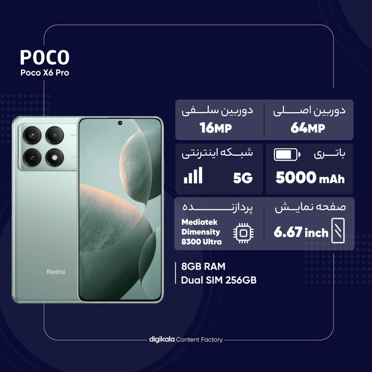 سری پوکو گوشیهای میانرده شیائومی توانستهاند در کنار بهره بردن از مشخصات قدرتمند که حتی در برخی از موارد قابلیت ارائه عملکردی در حد و اندازه گوشیهای پرچمدار را دارند و البته قیمتی مقرون بهصرفه، توانستهاند طرفداران بسیاری را به سمت خود جلب کنند. شیائومی Poco X6 Pro یکی از میانردههای جذاب این شرکت است که در برخی از مشخصات فنی در نظر گرفته شده، توانایی ارائه عملکردی نزدیک به پرچمداران گرانقیمت را دارد. در نمای روبهرویی این گوشی به صفحهنمایش با ابعاد 6.67 اینچ و رزولوشن 1220×2712 پیکسل از نوع امولد با توانایی نمایش 446 پیکسل در هر اینچ مجهز شده است. از جمله قابلیتهای قدرتمند این صفحهنمایش میتوانیم به نرخ بروزرسانی 120 هرتز و حداکثر روشنایی 1800 نیت (nits) اشاره کنیم. چنین مشخصاتی سبب شده تا وضوح تصویر بسیار خوب در شرایط نوری متنوع و عملکرد بسیار روان در اجرای بازیهای سنگین را شاهد باشید. در قسمت پشتی این گوشی هم یک سنسور دوربین اصلی با رزولوشن 64 مگاپیکسل در کنار سنسور دوربین 8 مگاپیکسل فوقعریض و سنسور 2 مگاپیکسل ماکرو در نظر گرفته شده است. در بخش مشخصات سختافزاری هم این گوشی به پردازنده قدرتمند دیمنسیتی 8300 اولترا مجهز شده که به راحتی هرچه تمامتر از پس اجرای بازیهای سنگین برمیآید. باتری با میزان ظرفیت 5000 میلیآمپرساعت این گوشی هم به ازای هر بار شارژ صد درصدی، توانایی ارائه زمان آماده بهکار دو روز را دارد و باید بدانید که از فناوری شارژ سریع 67 وات هم پشتیبانی میکند. در مجموع میتوانیم بگوییم که اگر به دنبال خرید گوشی میانردهای هستید که در برخی از مشخصات فنی در نظر گرفته شده، توانایی رقابت با پرچمداران را داشته باشد، شیائومی Poco X6 Pro میتواند یکی از گزینههای بسیار مناسب برای شما باشد.