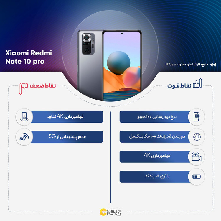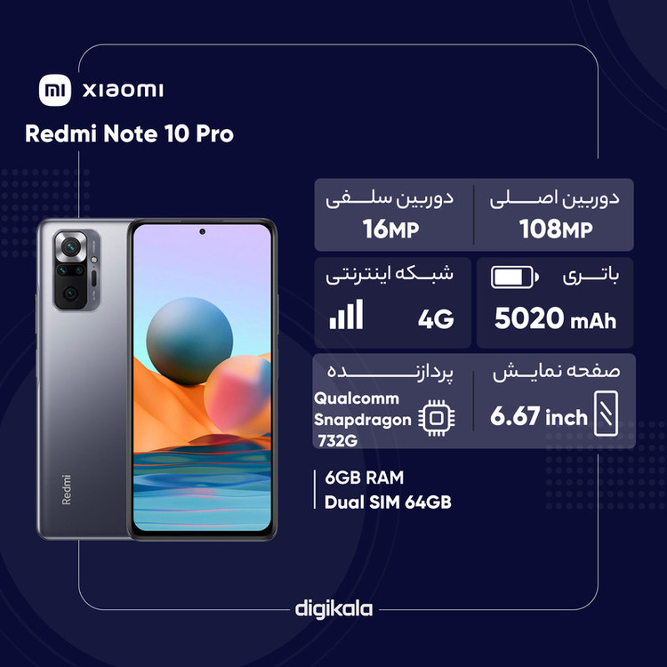 گوشی موبایل شیائومی مدل Redmi Note 10 pro دو سیم کارت ظرفیت 64 گیگابایت وارد بازار شده است. شیائومی در مارس 2021، نسل دهم از گوشیهای Redmi Note خود را معرفی کرده است. گوشی « Redmi Note 10 pro » مانند نسخههای قبلی این سری از گوشیهای شیائومی از صفحهنمایش بزرگ، باتری پرقدرت، طراحی جذاب دوربین و سختافزار مناسب برای اجرای بازی برخوردار است. این مدل با پنل AMOLED ساختهشده و فاصله لبه صفحهنمایش در آن بسیار کم است. این نمایشگر 6.67 اینچی حدود 395 پیکسل را در هر اینچ جا داده است. بدنه و نمایشگر این محصول با استفاده از Corning Gorilla Glass 5 محافظت میشود تا گوشی در برابر خط وخش ایمن باشد. ویژگی دیگر Redmi Note 10 pro مجهز شدن به حسگر اثرانگشت بر روی لبه کناری آن است. شیائومی برای این محصول خود از یک دوربین چهارگانه استفاده کرده است. لنزعریض 108 مگاپیکسلی، لنز فوق عریض 8 مگاپیکسلی، لنز ماکرو با کیفیت 5 مگاپیکسل و سنسور عمق 2 مگاپیکسلی مجموعه دوربین Redmi Note 10 pro را تشکیل میدهد. یک دوربین سلفی 16 مگاپیکسلی هم در مرکز بالای نمایشگر این گوشی به کار گرفته شده است. ازنظر سختافزاری هم این گوشی از تراشه Snapdragon 678 بهره میبرد که در آن پردازندهای هشتهستهای و قدرتمند قرارگرفته است. حافظه رم با ظرفیت 6 گیگابایت هم در کنار این مجموعه قرار گرفته است تا بتواند علاوهبر کارهای معمول، از قابلیتهای جدید گوشیهای امروزی پشتیبانی کند. باتری 5020 میلیآمپرساعتی با پشتیبانی از شارژ سریع 33 وات، درگاه ارتباطی USB Type-C 2.0 و جک 3.5 میلیمتری صدا هم از دیگر مشخصات این محصول جدید است.